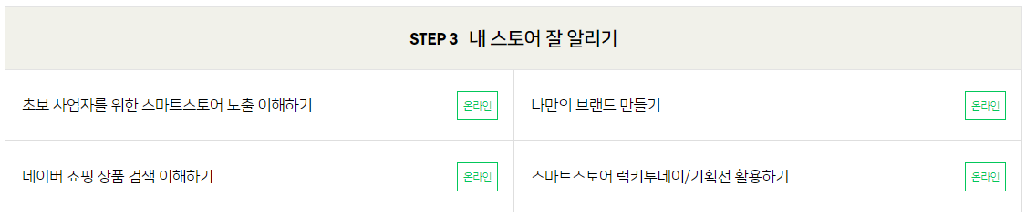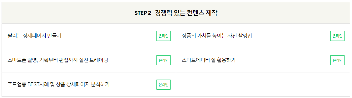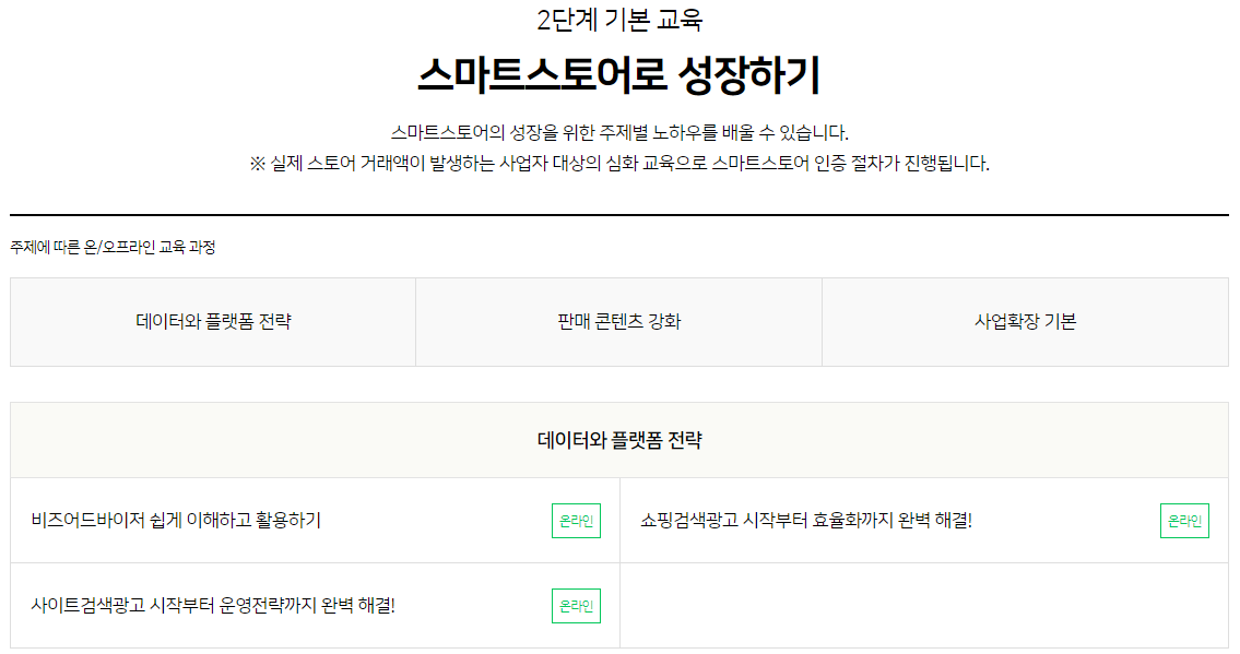 2단계 심화 교육은 데이터와 플랫폼 전략, 판매 콘텐츠 강화, 사업 확장 기본 3가지로 구성되었으며 역시 스텝마다 강의 수량이 다르지만 꼭 수강해봐야 할 온라인 강의다! 생각보다 굉장히 초보자도 쉽게 받을 수 있는 내용이기 때문에 무조건 한번씩은 보길 바란다.