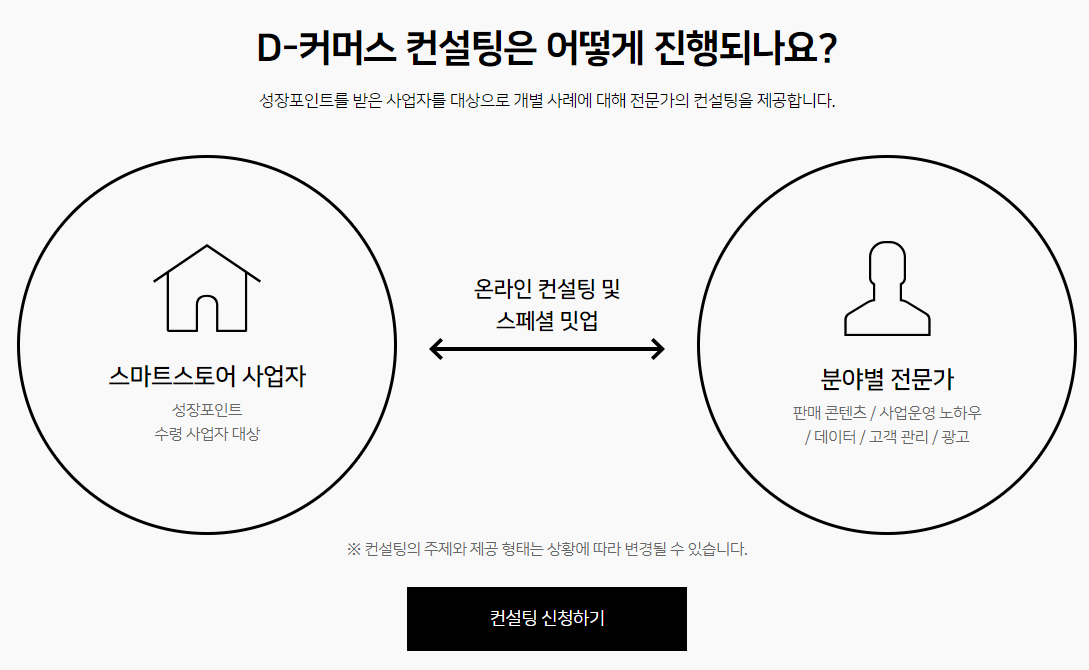 D-커머스 컨설팅은 성장 포인트를 받은 사업자를 대상으로 개별적으로 전문가의 컨설팅을 제공받을 수 있는 기회이기 때문에 우선 이런 것도 있다는 것 정도만 알고 있자!