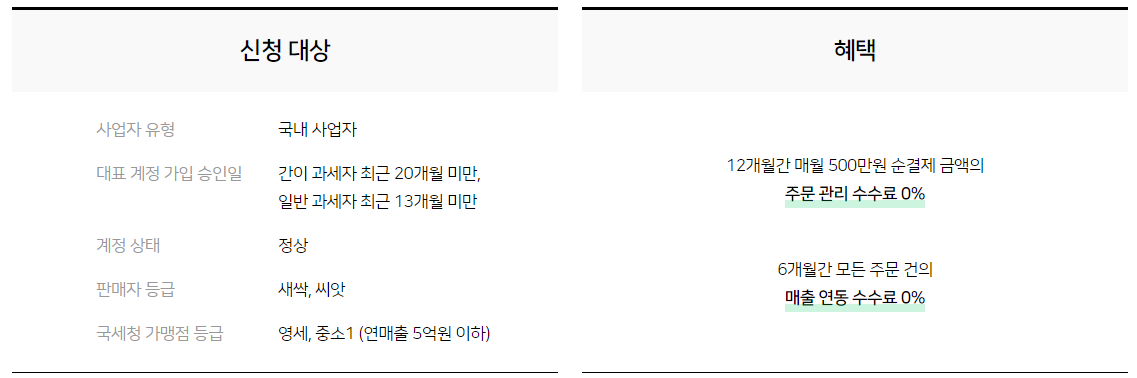 창업 초기 판매자의 사업 안정을 위해 주문 관리 수수료를 12개월 동안 매출 연동 수수료를 6개월간 무료로 지원해주는 시스템으로 스타트 제로 수수료 신청 후 익월 1일 일괄 승인되며 승인일 기준 최대 12개월간 지원되는 프로그램입니다.