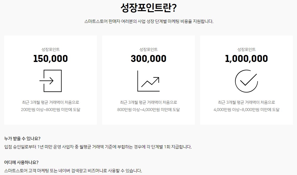 성장 포인트란? 스마트 스토어 판매자가 입점 승인일로부터 1년 미만 운영 중 월평균 거래액 기준에 부합하는 경우 각 단계별 1회 지급되는 포인트로 광고비나 리뷰 이벤트로 사용하면 된다.