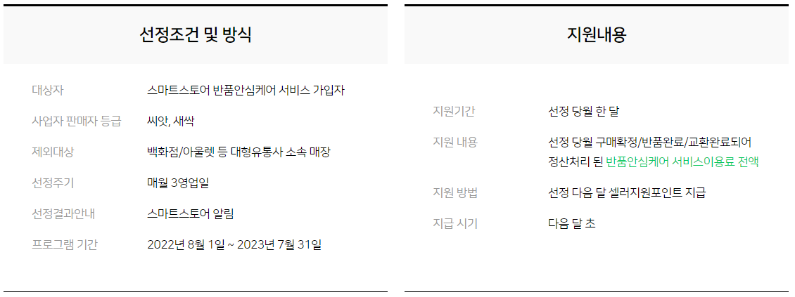 반품안심케어 가입 판매자 중 씨앗, 새싹 등급의 셀러에게 반품안심케어 서비스 이용료를 셀러지원 포인트로 지원하는 시스템입니다. 대상자는 선정일 1일 24시 기준 반품안심케어 서비스에 가입된 상태에서 가입할 수 있으며 셀러지원포인트 지급 내역 확인은 "스마트 스토어센터-고객혜택관리-포인트 지급내역 조회" 메뉴에서 확인할 수 있다.