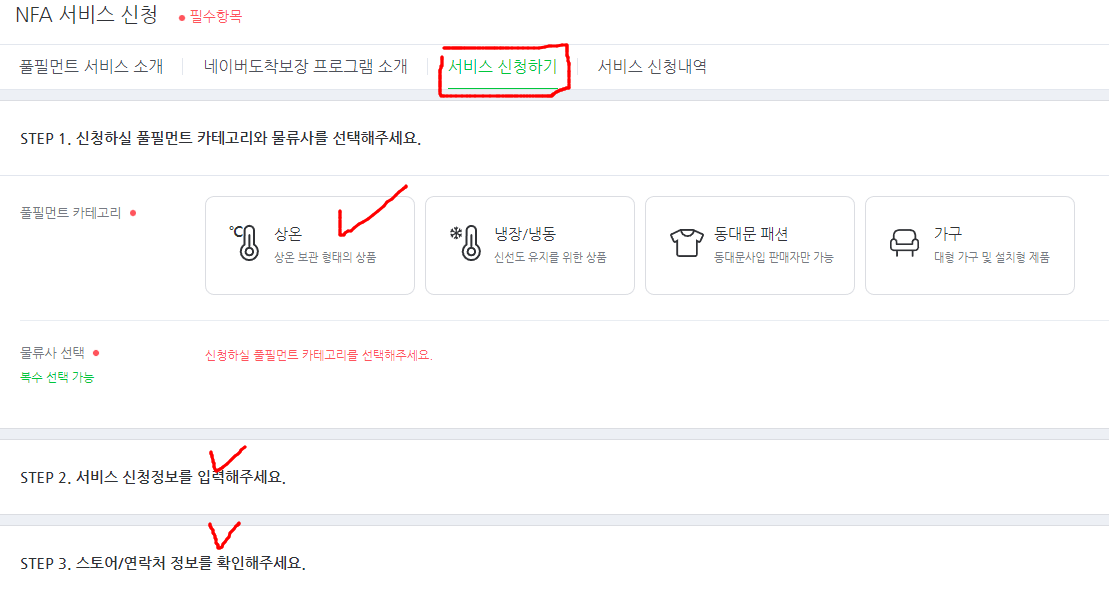 풀필먼트 서비스 고개, 네이버도착보장 프로그램 소개, 서비스 신청하기, 서비스 신청내역을 확인할 수 있는 메뉴