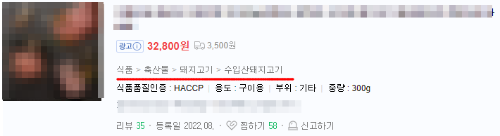 초보자분들은 이 부분을 잘 모르기 때문에 삼겹살 키워드만 넣고 수입산돼지고기 카테고리를 정하기도 하는데 국내산 삼겹살일 경우는 저 카테고리를 절대로 쓰면 안 된다. 참고로 삼겹살 키워드로 수입산돼지고기 카테고리의 상위를 차지하는 스토어들은 수입산돼지고기나 이베리코 같은 고기로 형성되어 있다.
